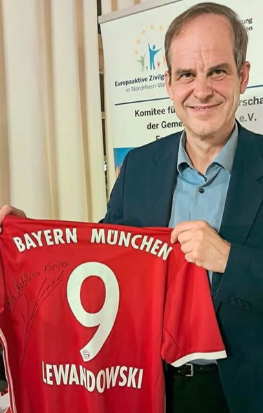 Matthias Kneip mit dem Trikot von Stürmerstar Robert Lewandowski.
